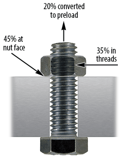 It is estimated that less than 20% of the tightening torque is actually used to preload (tighten) a bolt with the remaining 80% or more being being required to overcome the combined frictional resistance between the thread forms and the nut or bolt head face.